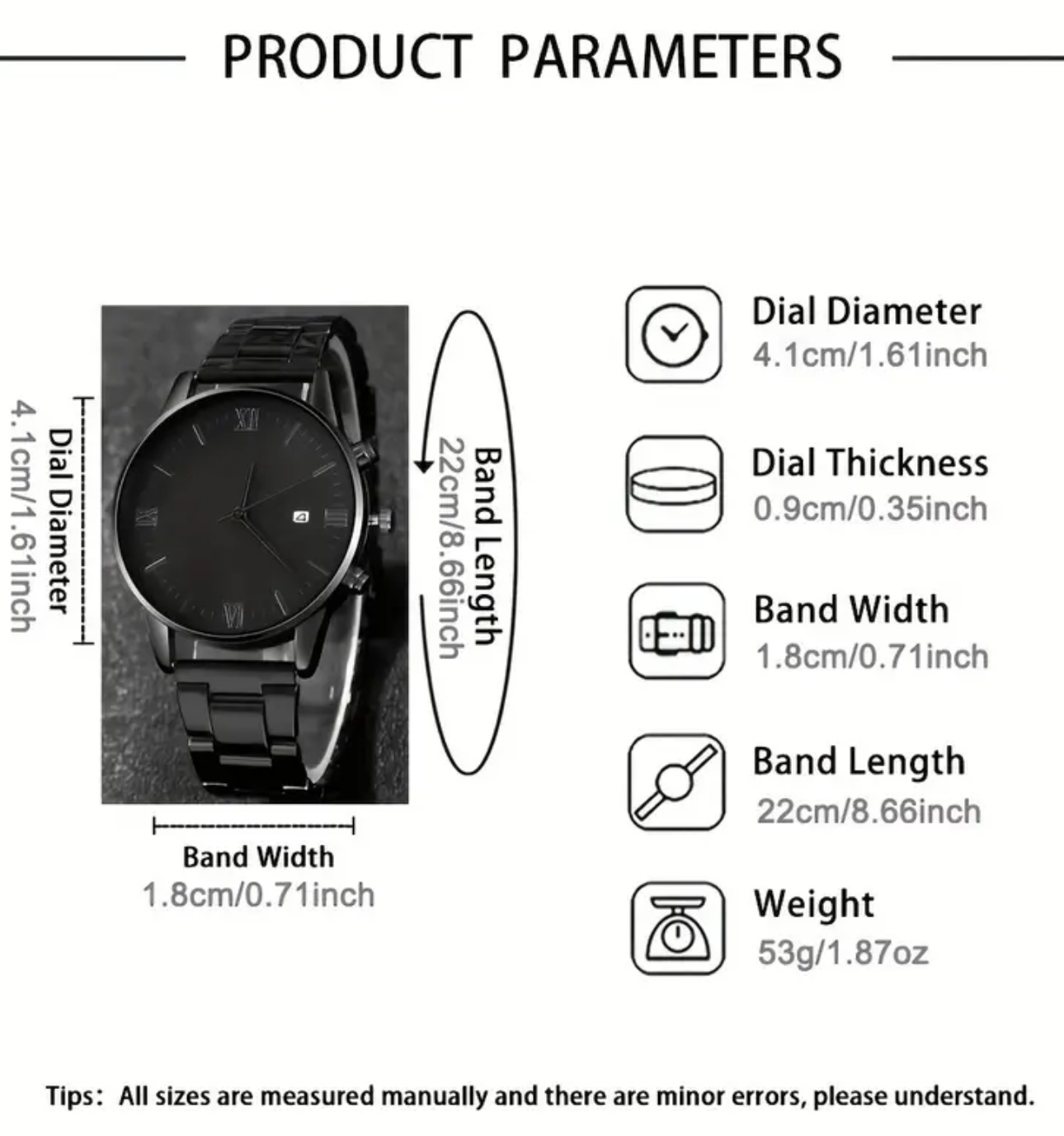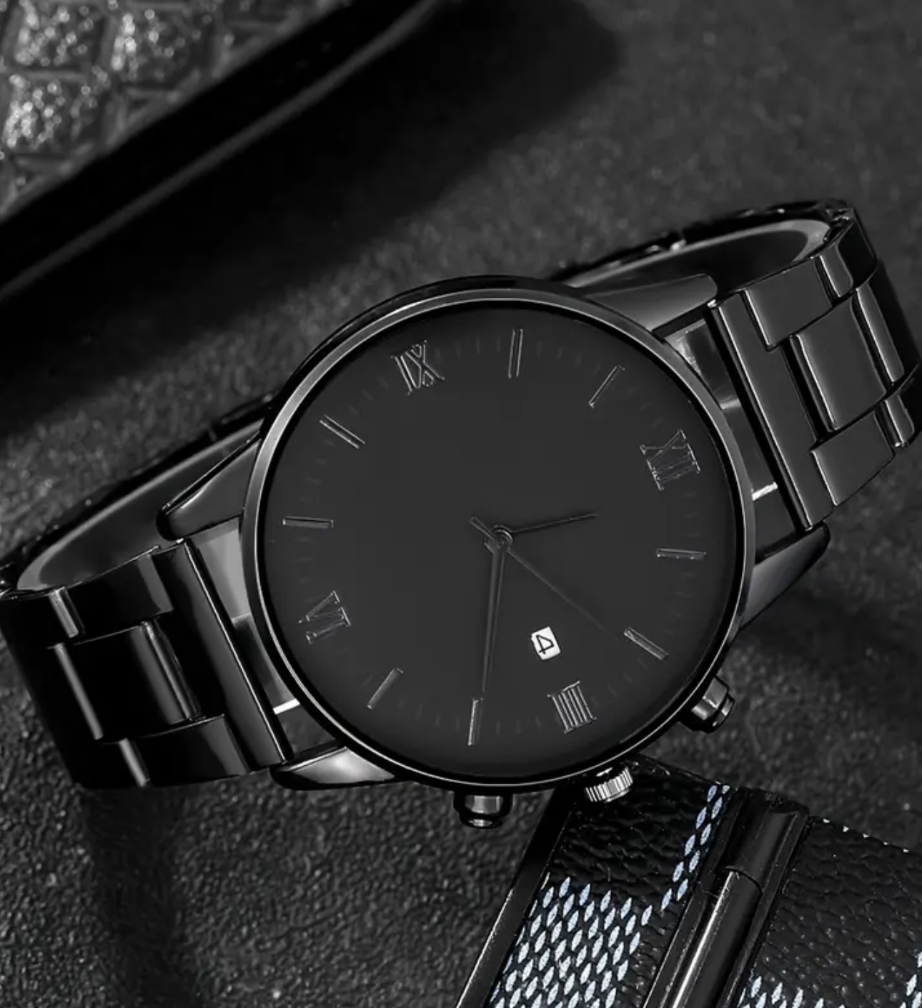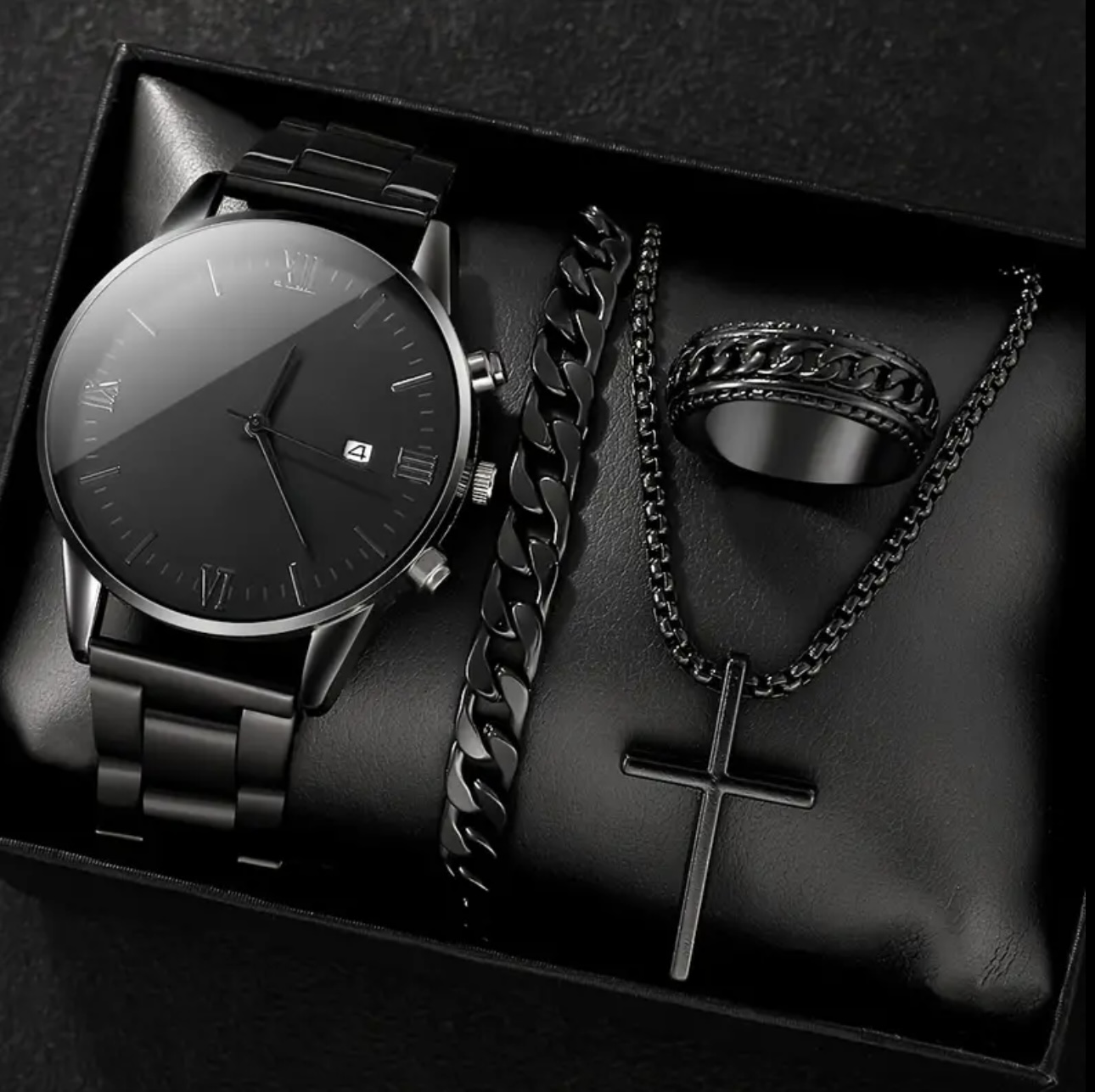 4 pzas/set Reloj de Cuarzo Redondo Negro y Elegante para Hombre - Incluye Collar con Colgante, Anillo y Pulsera - Regalo Perfecto para Él, Ideal para Cualquier Ocasión